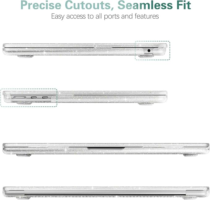 - Precise Cutouts: This glitter MacBook Air 13.6 inch case is designed to fit the original MacBook using micro-3D cutting technology. It has precise openings and cutouts for easy access to all ports and features. The transparent design complements the aesthetics of your MacBook and displays the Apple logo while providing a snug fit that feels like a second skin. Additionally, it opens and closes smoothly.