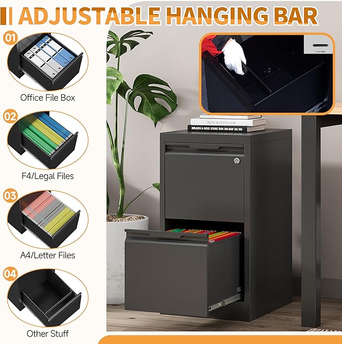 - 【Large Capacity】This vertical file cabinet for home office has large storage space, fully retractable ball bearing drawer slide rails for easy access to all folders, file drawers with adjustable hanging rods can hang A4 size, letter size or legal size hanging folders to make your files well organized.