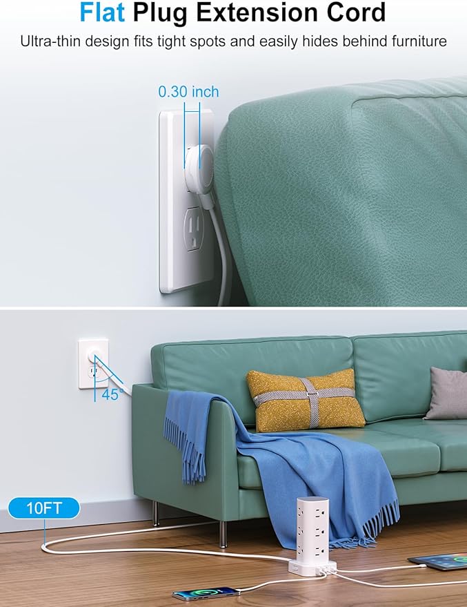 - Flat Plug Power Strip & 10 FT Extension Cord: With a mere 0.30-inch ultra-thin flat-head plug design, this power strip sits flush against the wall and effortlessly fits into tight spaces behind sofas, nightstands, bookshelves, and headboards. The 45Β° right angle design creates an extra space for other plugs below without blocking. With a 10FT extension cord that's long enough to give you the freedom to use it anywhere - homes, offices, or college dorm rooms