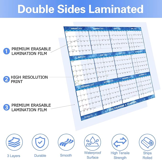- Premium Laminated Paper - This large 2026 wall calendar is made of high double thick paper and a finishing coat to prevent ink through and avoids feathering with a stain-resistant surface. Itβs easy to be wiped and clean with a touch of water without leaving any stain or ghosting.