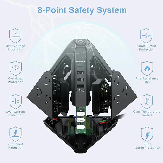 - Upgraded Triangle Design Outlet Extender: 3-sided 1625 Watt power outlet tower with 9 x 125V/13A AC ports, 3 x 5V/2.4A MaX USB-A ports and 1 x 5V/3.1A MaX USB-C port. The outlet extender can power multiple devices at the same time, making it suitable for any indoor location such as homes, offices, dormitories, etc.