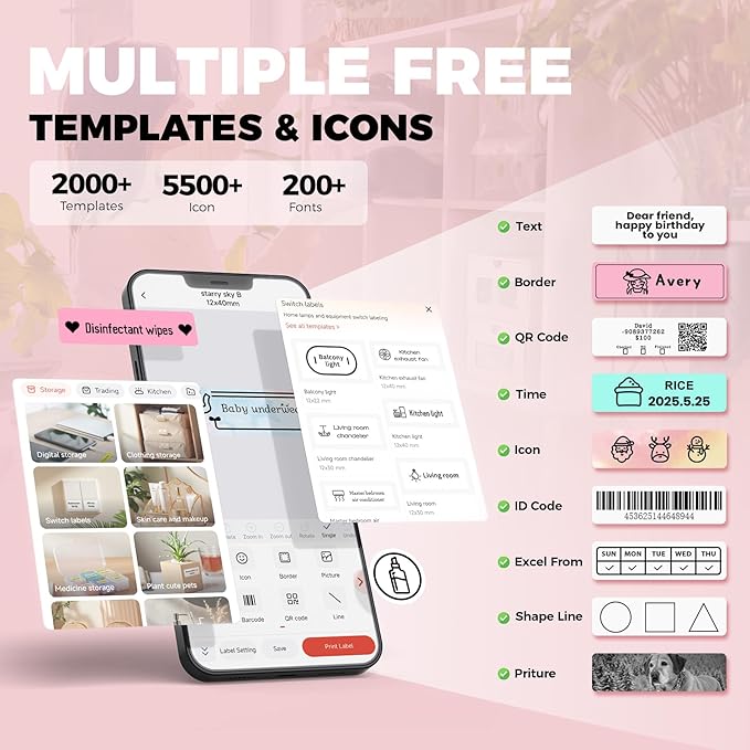 - Feature-Rich and Template-Diverse: Print Master APP provides over 15 languages, 115 fonts and 650 materials, making it easy to customize labels. And it supports printing various texts, numbers, graphics, symbols, logos, barcodes, QR codes, etc. The portable label maker can meet all your note needs