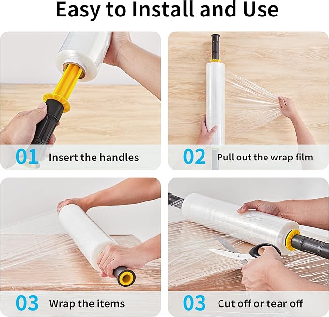 - Handle Design: We designed the handle for this stretch film. As long as the handle is inserted into the holes on both sides of the stretch film, you can easily use it for packaging items. The packing work will be faster and more efficient.