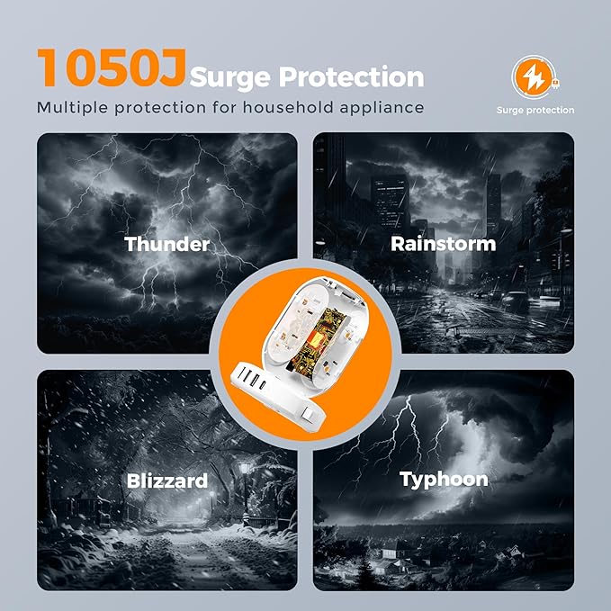 - Surge Protector 1050J: Equipped with surge protection protect your computers and other devices, from power surges and spikes, providing a secure and reliable charging environment; The indicator let you know the flat plug power strip is on