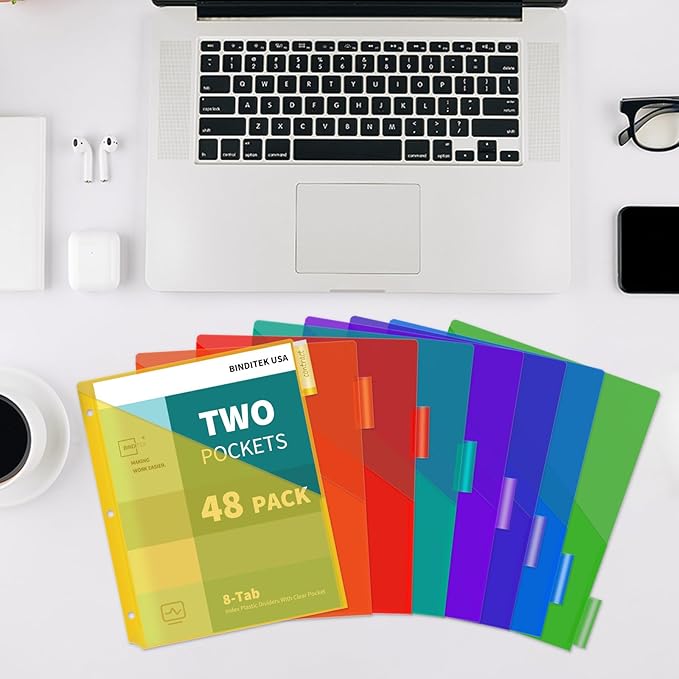 - 6 Sets & Efficient Color Coding: This pack includes 6 sets of 8-tab plastic binder dividers in vibrant, transparent colors: purple, red, blue, navy, orange, green, aqua green, and yellow. These colorful dividers, each featuring two convenient pockets, help you organize your binder instantly. Perfect for home, office, or school use, they neatly separate your documents and keep them easily accessible.