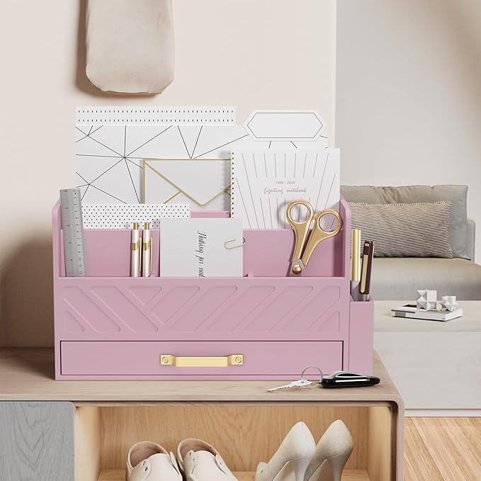 Bamboo Desk Organizer Mail Holder Countertop Wood Desk Drawer Tabletop Storage Box Pen Holder Letter Sorter Makeup Organizer for School Home Office Supplies with Pen Holder Pink