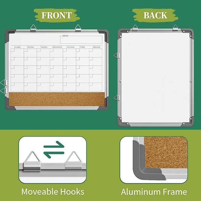 - 3-in-1 Dry Erase Board&Cork Board: The dry erase calendar helps you to keep track of your time, dates, and appointments in visual ways, corkboard at the bottom is great for receipts, tickets, notes, lists, pictures, etc. The magnetic whiteboard calendar have double-sided design, allowing you to have two projects going on. The front side is printed with an undated monthly calendar grid, you can write down dates, monthly schedule and make to do list plans. The other side is blank, it is perfect for school home teaching or memo, you can hang on the wall to jot down upcoming events, deadlines, appointments, projects, and important reminders.
