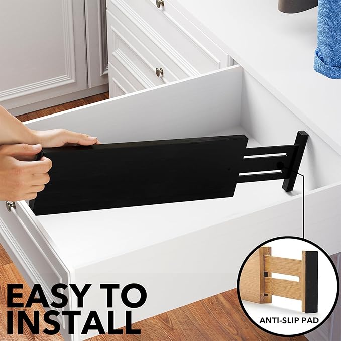 - Drawer Dividers That Stay in Place: Strong spring-loaded design makes them sturdy dividers, with non-slip rubber pads in the end, keeping it stay put all the time and protect your drawers from scratches