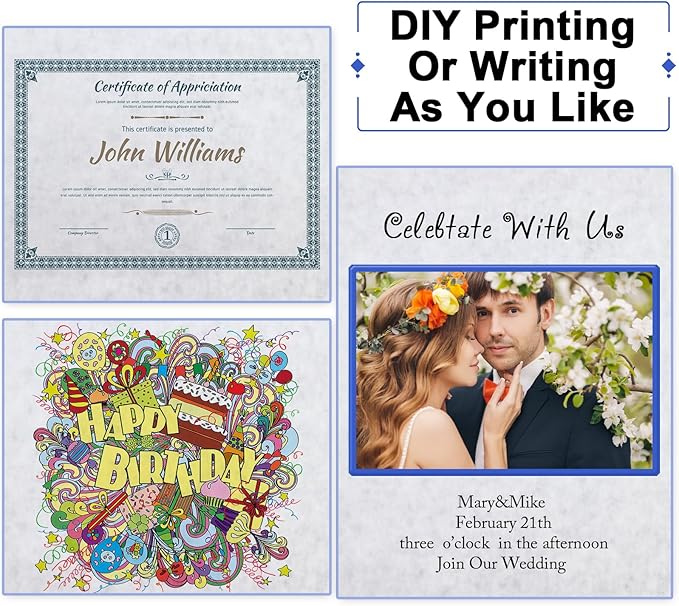 - Work As Different Things: these plain certificate papers are flexible in use, you can use them as certificate printing, wedding invitation, birthday invitation, restaurant menu, theme party decoration and so on, running smoothly in laser and inkjet printers, copiers and offset applications without jams