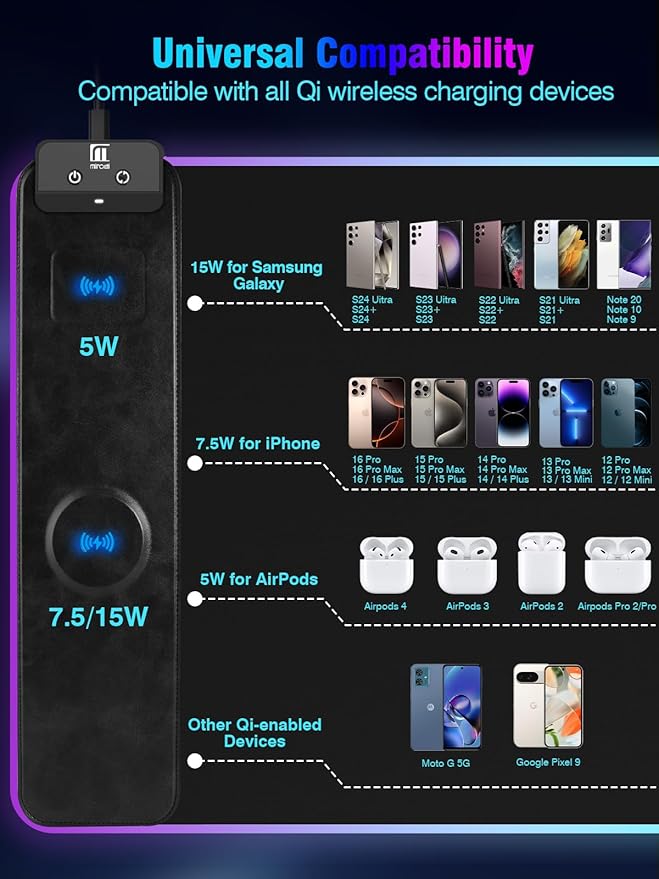 - All-in-One Desk Mat Mousepad: 15W Magnetic Fast Wireless Charging Mouse Pad for Samsung Galaxy S23/S22/S21/S20/S10/S9/S8/Note 9/8, iPhone 17/16/15/14/13/12/11/X/8 series, Airpods Pro 2nd/Pro/4rd/3rd/2rd(only for wireless charging case) and other Qi-enabled devices. (Note: 15W fast charging requires 18W/20W Power Adapter, which is not included in the this Mousepad.)