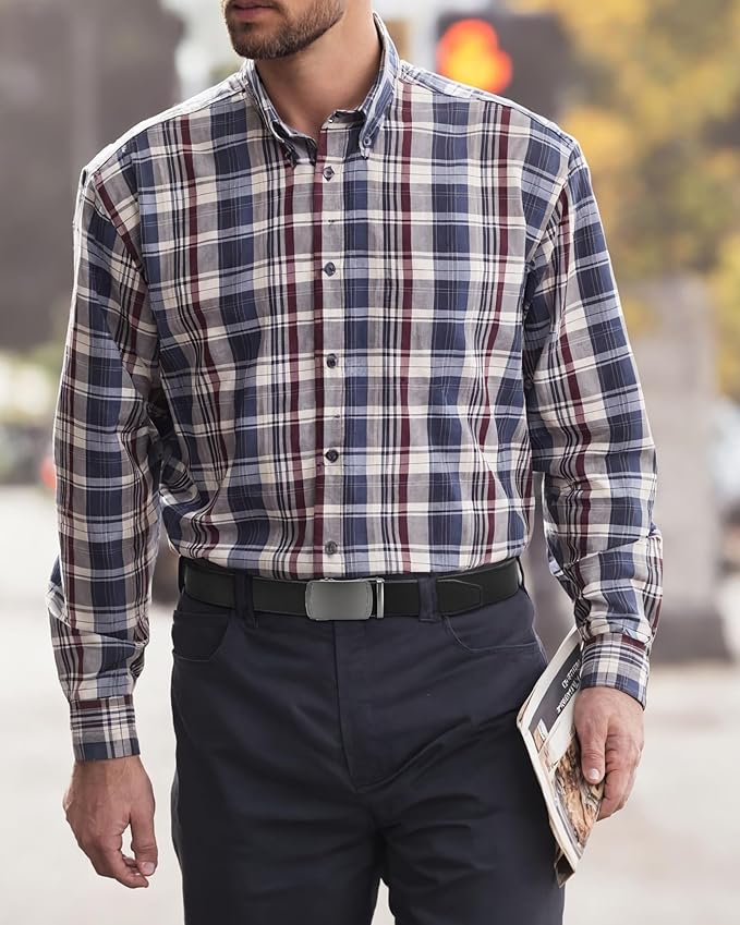- Effortless to Use: Experience the ultimate convenience with our black leather belt. Simply slide it into the sliding buckle, pull it through, and the click-it buckle automatically locks in place. Releasing the jeans belt is just as easy - gently push the lever on the side of the automatic buckle, and the lock snaps shut. Enjoy the seamless simplicity and smoothness of our ratchet belt design.