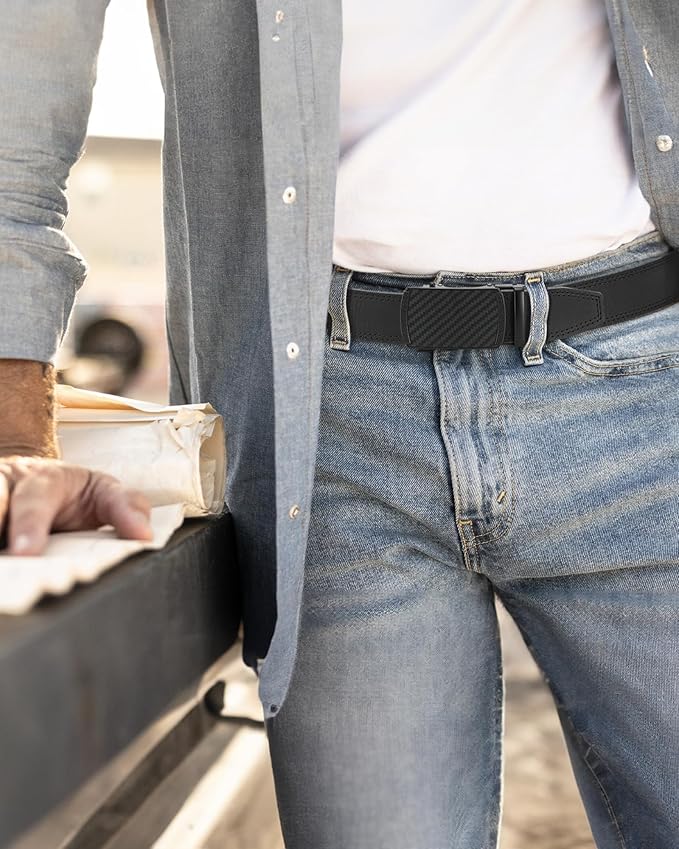 - Effortless to Use: Experience the ultimate convenience with our black leather belt. Simply slide it into the sliding buckle, pull it through, and the click-it buckle automatically locks in place. Releasing the jeans belt is just as easy - gently push the lever on the side of the automatic buckle, and the lock snaps shut. Enjoy the seamless simplicity and smoothness of our ratchet belt design.