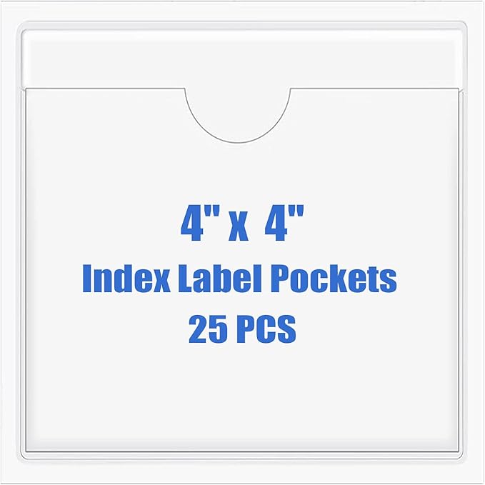 Origin-Joy 25 PCS Self-Adhesive Index Label Pockets, Clear Plastic Peel & Stick Card Holders with Top Open for Loading (4 x 4 inch)