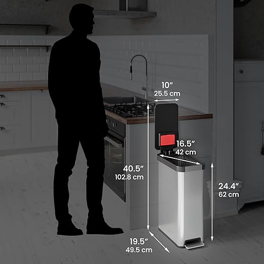 - DIMENSIONS β 19.5 inch Length x 10 inch Width x 24.4 inch Height (41 Height H with lid open). This Stainless Steel Kitchen Trash Can is compact, yet with an extra-large capacity.
