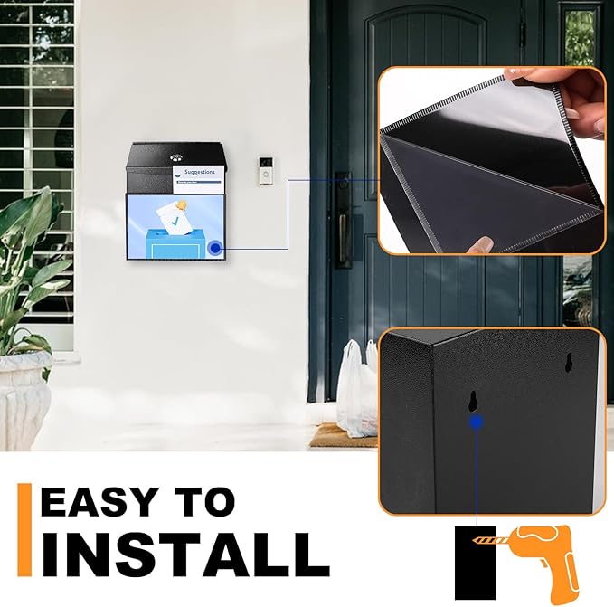 - Military-Grade Security Key System:Crafted from 0.7mm reinforced steel with anti-corrosion coating, our suggestion box withstands extreme impacts & harsh environments.We include TWO MASTER KEYS (tested 10,000+ cycles) – preventing unauthorized access to ballots, cash donations, or confidential feedback.
