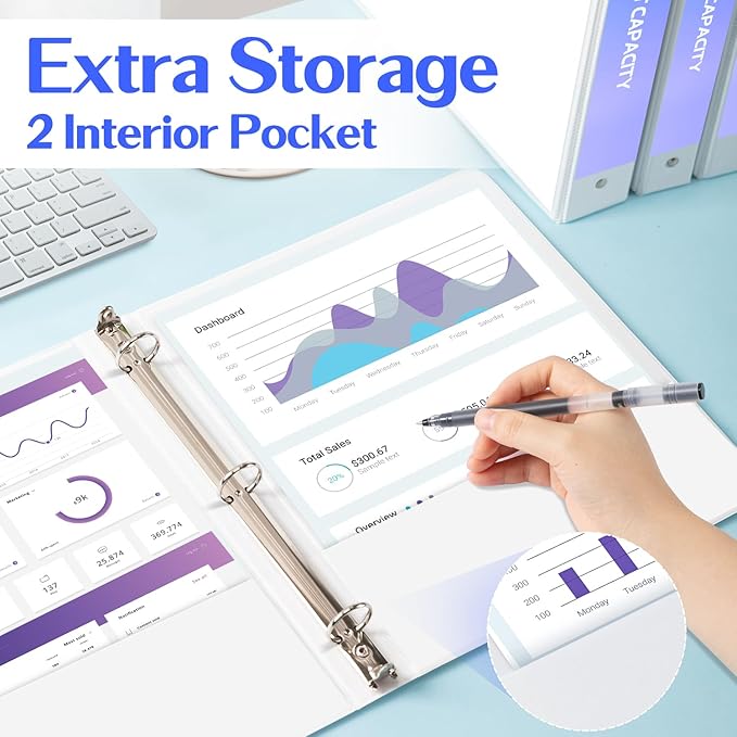 - Large Capacity: Each binder holds up to 175 sheets of 8.5x11 inch paper or 3-hole folders, with 2 interior pockets for storing unpunched or scattered papers.