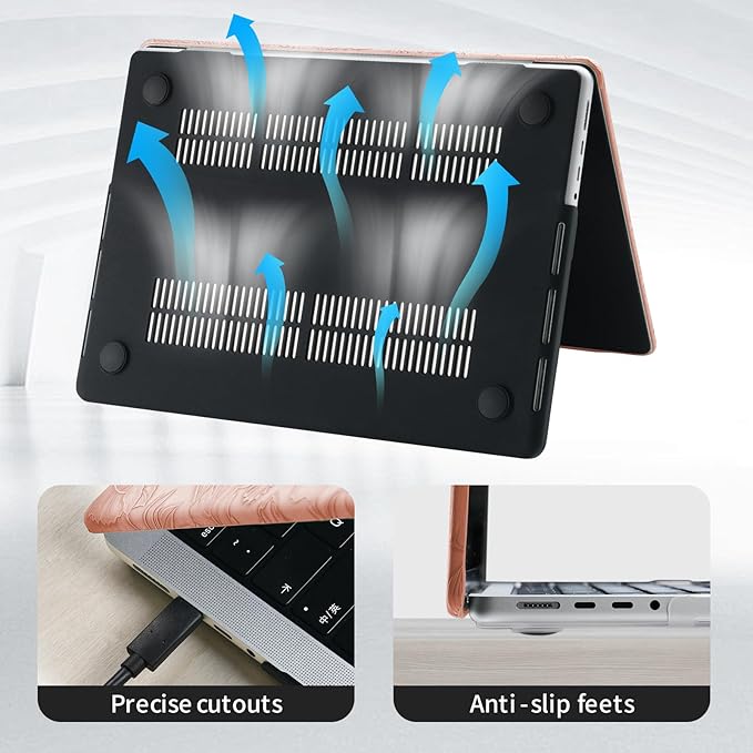 - PREMIUM MATERIAL: Elegant Leather Mac Book Air 15 Case is made from premium, scratch resistance pu leather and impact resistance pc material, the surface is covered with embossed leaves and floral, forming a protective layer similar to "ultra-thin armor", it can effectively protect your device from fingerprints, scratches, shocks, dents and other damages. Coming with silicone keyboard cover to prevent keyboard from food crumbs, liquid spills and key wear