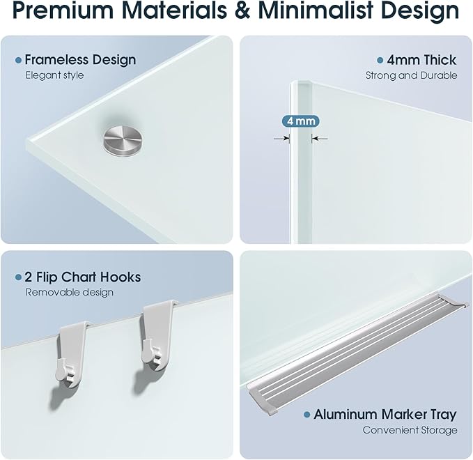 - Frameless Modern Design : Featuring a minimalist frameless floating design and craftsmanship, this board delivers smooth writing, effortless erasing, and a clear display, seamlessly enhancing your office, classroom, or home