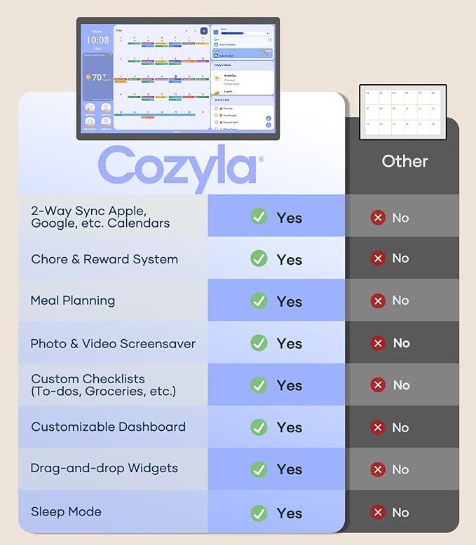 - Simplify Your Life: Make family life easier with our family calendar electronic. It works seamlessly with the Cozyla+ mobile app, so you can manage schedules and update events anytime, anywhere.