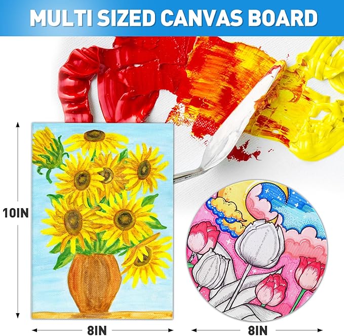 - 【78PCS All-in-One painting Kits】: The diverse artist canvas painting kit includes 12 colors acrylic paint, 12 colors watercolor paint and 12 colors oil . 3 adjustable wooden easel, 10 PCS acrylic brushes(nylon), 10 PCS oil brushes(hog bristle), 10 PCS watercolor brushes (horsehair). 3 Pcs 8×10” canvas panel, 3 Pcs 8×8” round canvas panel, 3 art palette. Diverse combinations,allow you to experience painting with different paints at once.