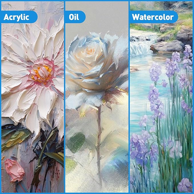 - 【Rich And High Quality Paints】: Our painting supplies set provides 3 types of paints (12 colors Acrylic, 12 colors Oil, 12 colors Watercolor) at the same time! They are safe and friendly, conforms to ASTM D-4236 certificate. Both adults and kids can try this canvas and paint set. Our paint adopts a unique formula and high-quality pigments, colorful and easy to mix, can bring maximum brightness and color clarity.