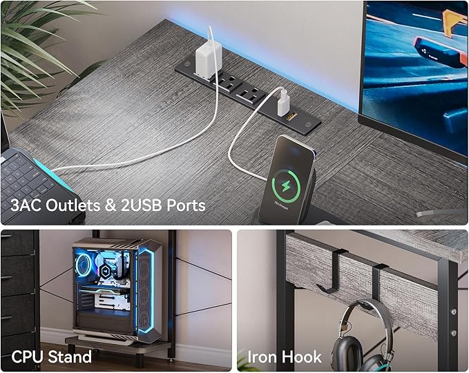 - 【Built-in power outlet】This gaming desk comes with a recessed power outlet that provides 3 AC outlets and 2 USB ports. This l desk simplifies the process of charging devices such as laptops, smartphones and tablets with greater convenience and safety. Whether you're playing games or working intensely, you'll stay powered up without cluttering your space with extra extension cords.
