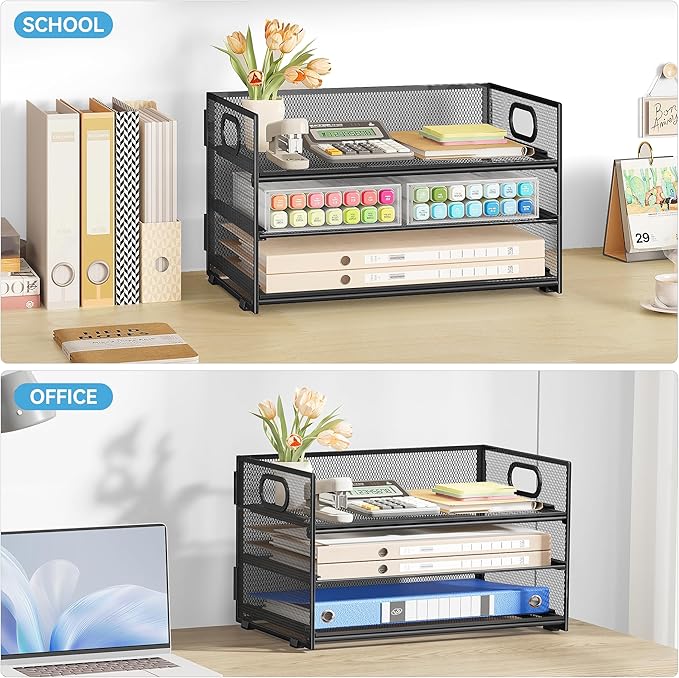 - Aesthetic Decor Design: The 3 tier paper tray organizer has a contemporary and minimalist design. The different color choices enhance the overall appearance, making it suitable for various decor settings, whether in a home office, business office, or school