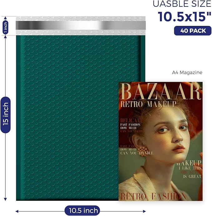 - Perfect Size: The opaque forest green bubble mailers outer size is 10.5x16 inch, while the inner size is 10.5x15 inch.It is very suitable to transport for clothing, shirts,books,magazines,calendar,photo frames and so on. Great for small business packing, mailing.