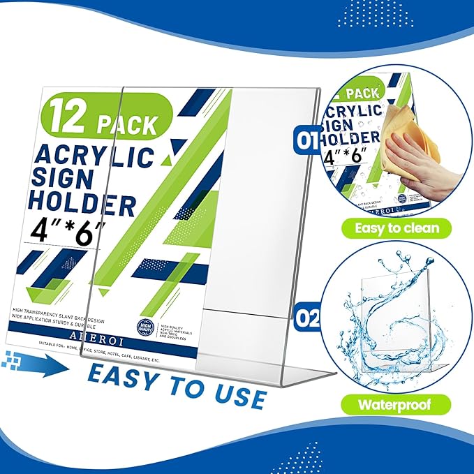 - Package Includes: You will get 12 pieces of 4″x6″ vertical acrylic sign holder, each clear sign holder is super clear, just covered with a thin protective film, so you need to remove the film before use. (Easily peel off the film by gently hanging up the protective film around the edges with your fingernail)