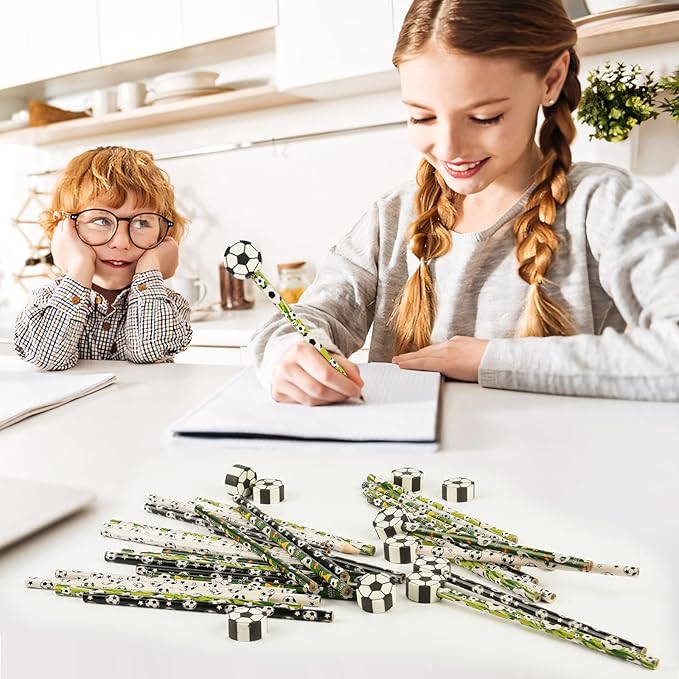 - Package includes: the package contains 48 pieces of Soccer pencils and 48 pieces of mini erasers, enough to use and share with family or friends on different occasions, Sports party favors use.