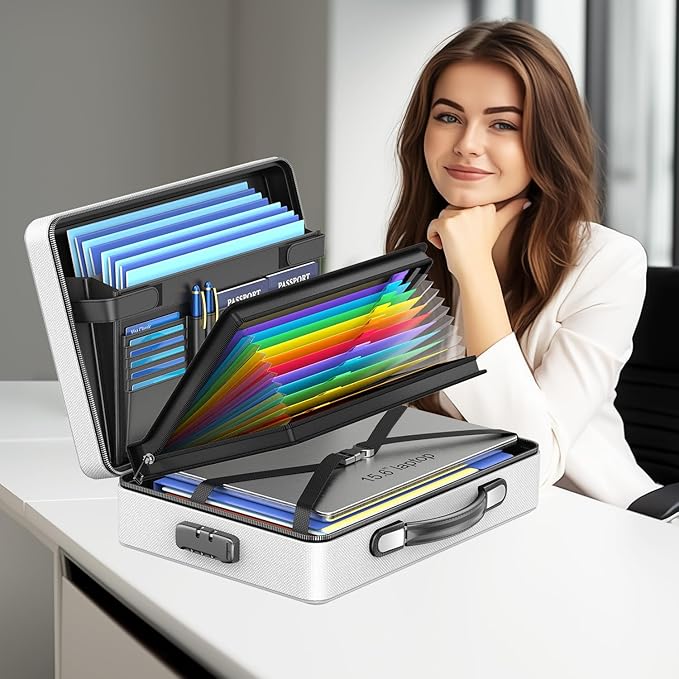 - 【Upgraded Large Capacity】Outside size :16 x 11.2 x 4.6 inches. Inside Size : 15.1 x 10.4 x 3.8 inches. This large capacity fireproof box is equipped with a 12-page accordion folder with zipper, 2 spacious expanding folder pockets, 6 business card slots, 2 pen slots, and a zipper pocket. The main large compartment can accommodate up to a 15.6-inch laptop inside. There is enough space to safely and orderly store your documents, money, passport, and certificates.
