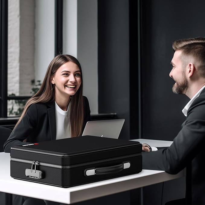 - 【Upgraded Large Capacity】Outside size :16 x 11.2 x 4.6 inches. Inside Size : 15.1 x 10.4 x 3.8 inches. This large capacity fireproof box is equipped with a 12-page accordion folder with zipper, 2 spacious expanding folder pockets, 6 business card slots, 2 pen slots, and a zipper pocket. The main large compartment can accommodate up to a 15.6-inch laptop inside. There is enough space to safely and orderly store your documents, money, passport, and certificates.