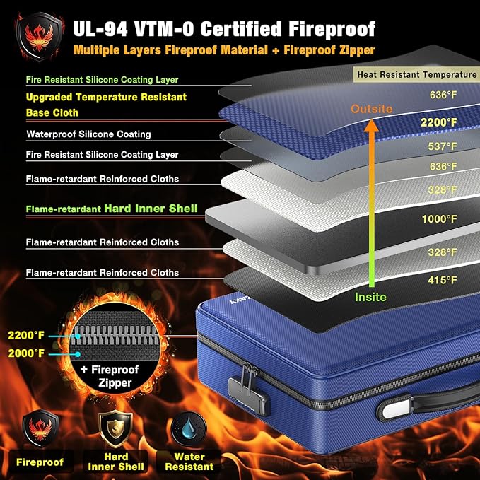 - 【Multi-Layer Fireproof & Defense】Featuring a hard inner shell and a soft exterior made of multilayer fireproof material. The introduction of a fireproof metal zipper for the first time has elevated the safety level of the fireproof box. The fireproof metal zipper is made of high-strength metal teeth and high-density fireproof base cloth, which can effectively block flames from the outside in all directions.