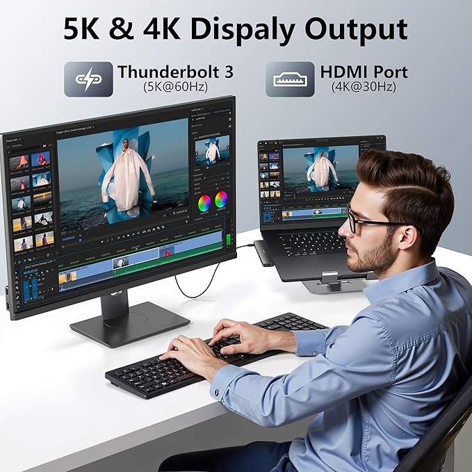 - Dual USB C Female Port: The first usb c port is a original thunderbolt 3 port like the macbook itself which support data transfer up to 40Gbp/s, up to 5K display and up to 100W power; Another usbc port is a data transfer port which speed can up to 5Gbps, a best port for USB C Device like ssd hdd,etc. Notice: The second usb c port of this usb c hub doesn't support HDMI output and charging function