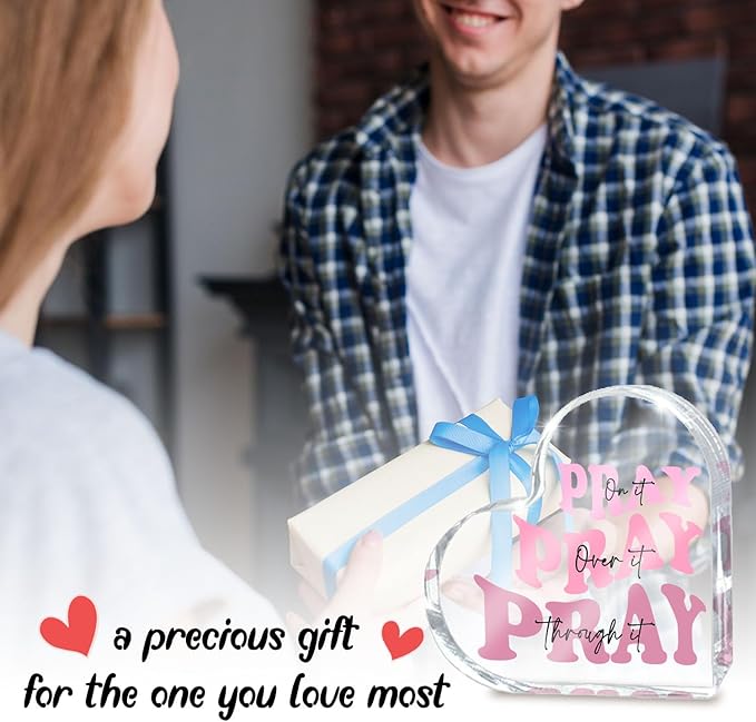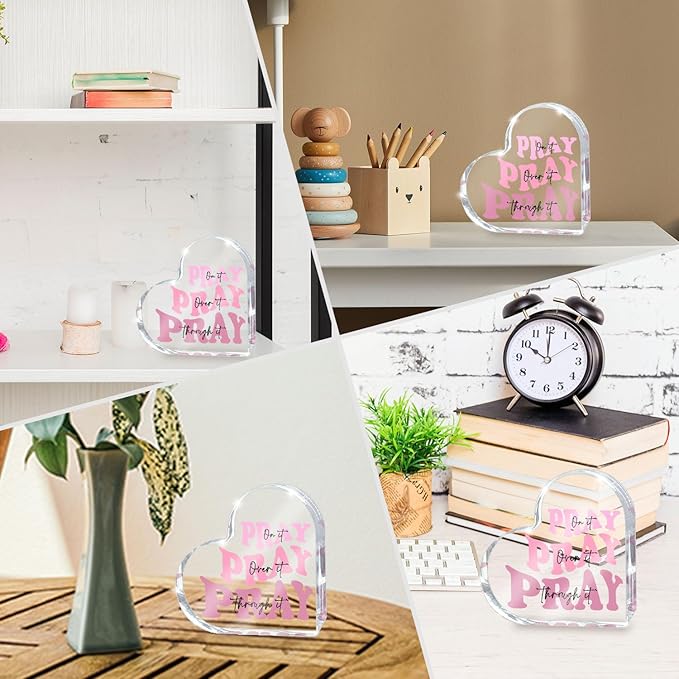 Pray on it Pray over it Pray through it Heart Acrylic Sign, Decorative, Pink Dorm Room Decor for Women, Pink Office Desk Accessories Decor Sign, Bathroom Acrylic Sign(Heart)