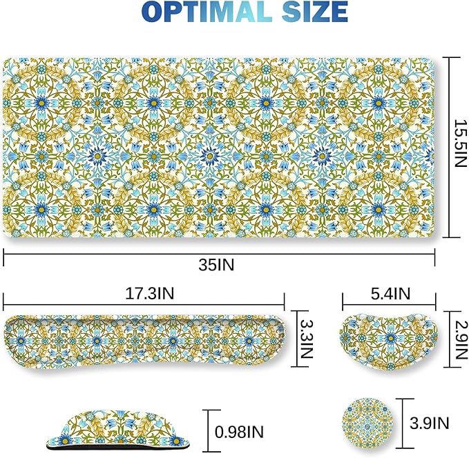 - 4-in-1 Mouse Pad Set: Ergonomic mouse pad includes desk pad (35x15.5inch), keyboard wrist rest(17.3x3.3inch), mouse wrist rest(5.4x2.9inch), cup coaster(3.9x3.9inch).No need to buy separately, at a super cost-effective price. This desk pad for keyboard and mouse, is large enough to fit your mouse, gaming keyboard, and other desk items. Keep a clean, uncluttered desk. This helps to improve the gaming experience or work efficiency in the office.
