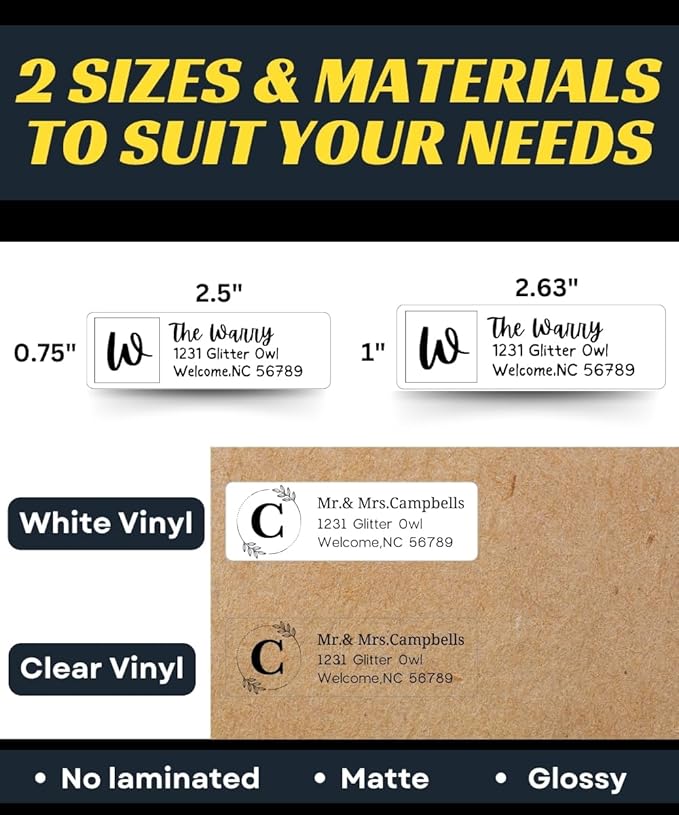 - 【2 Sizes & Materials to suit your needs】- Standard-size return address mailing labels:2.5" x 0.75" and large size:2.625" x 1"; Made from premium white vinyl labels and clear vinyl address labels with glossy and matte so they are durable and long-lasting.