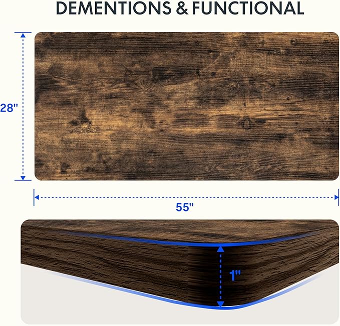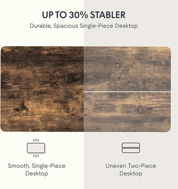 - AMPLE WHOLE-PIECE DESKTOP: With its whole-piece 1” eco-friendly desktop, this standing desk provides plenty of room for your computer setup, documents, and accessories, creating a well-organized and productive work environment. Due to hand measurements, desktop dimensions may vary slightly by 0 to 1”.