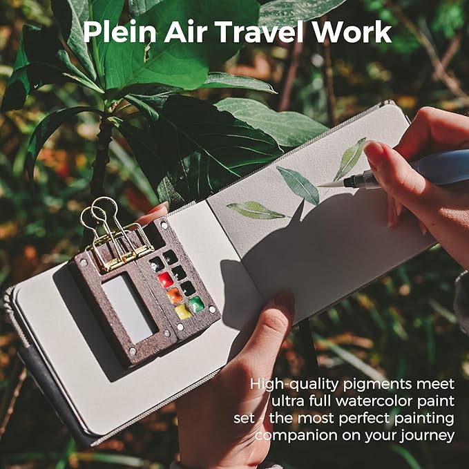 - POCKET SIZE DESIGN - The bag (6x5x1.2in), watercolor journal (3.5x5.5in), brush (6in), and palette are designed for maximum portability. The acid-free high-quality watercolor journal meets vivid colors, the first choice of plein air travel work