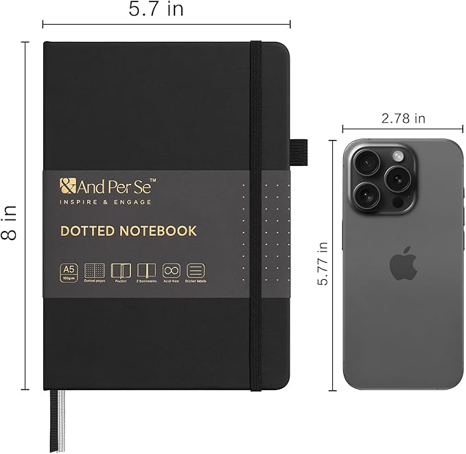 &And Per Se Dotted Journal Notebook (5 Packs), A5 Hardcover Leather Dotted Journal, 160 Pages 100 gsm Thick Paper, 3 Sheets of Stickers Included- 5.7'' x 8'' (Black