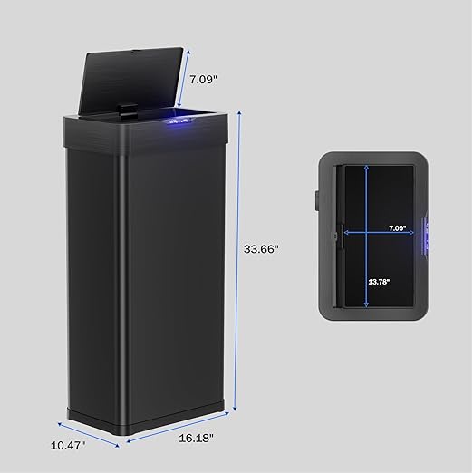 - 【Soft-Close Lid and Integrated Design】Sensor trash can lid has a slow-closing function, ensuring each closure is gentle and quiet, reducing noise and disturbance to nearby people while also enhancing the trash can's sealing ability. Trash can opening measures 13.78 × 7.09 inches, making it easy to deliver even large items