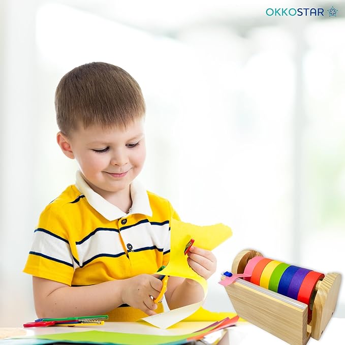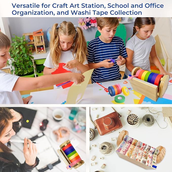 - 【CRAFT TAPE DISPENSER FOR MONTESSORI AND MORE】Wood masking tape dispenser for kids to easily sort, organize, and store masking tapes and craft tapes. Classic art and craft holder for Montessori settings. No more mess after art and craft activities!
