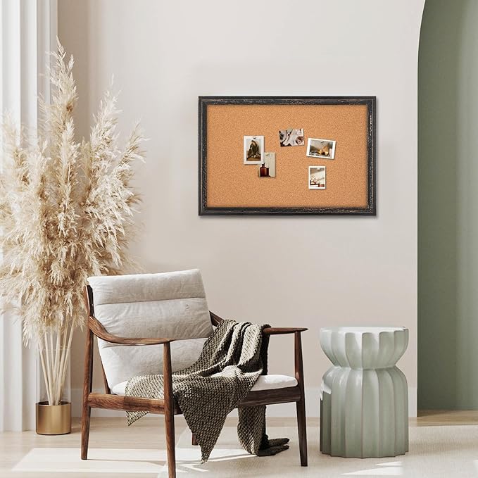 Cork Board Bulletin Board, 30" x 20" Corkboard for Wall, Rustic Black Wooden Frame, Decorative Hanging Pin Board for Home Office Room Decor, 10 Push Pins