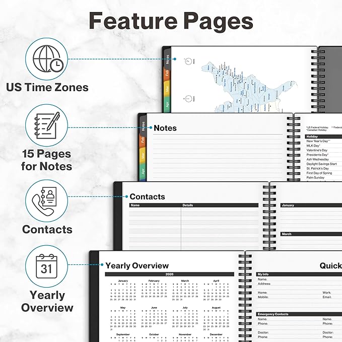 - COMPLETE TIME MANAGEMENT: quick-access to reinforced laminated monthly tabs, durable poly movable bookmark for quick navigation, yearly overview & important dates section for efficient daily planning.