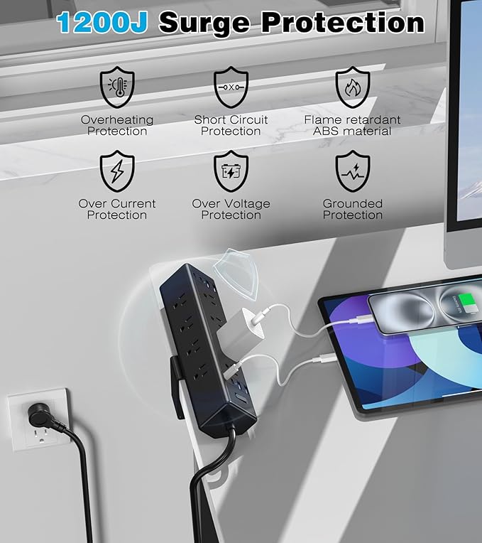 - 【Desk Clamp Power Strip with Surge Protection】Constructed from fire-resistant ABS plastic, this power strip offers a 1200-Joule surge protection rating with a built-in circuit breaker to guard against overloads, short circuits, and overheating. Effectively handles voltage spikes to keep your computer and other accessories safe.