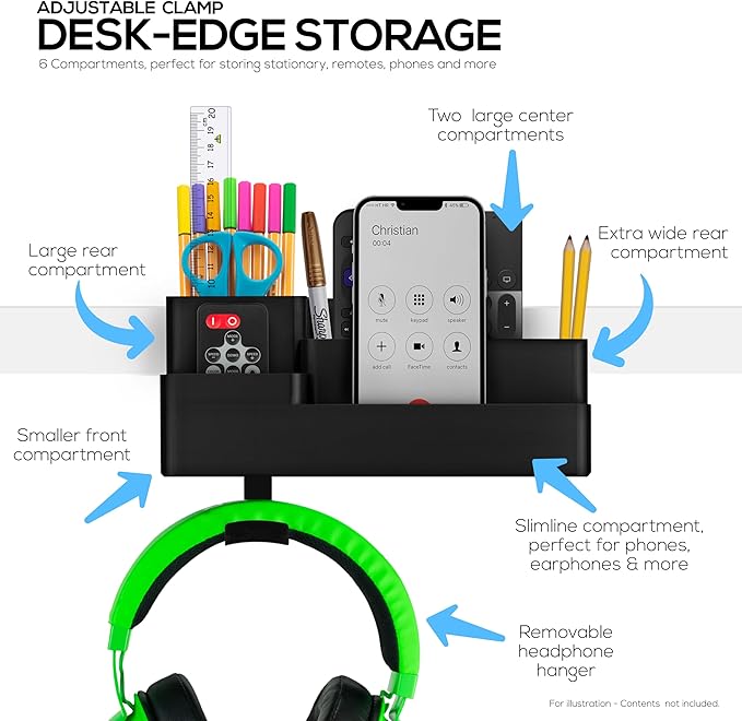- REMOVABLE HEADPHONE HOOK: Comes with a detachable headphone hanger that can be mounted on either side of the organizer using included thumbscrews, offering easy access to headphones or other hanging items without taking up additional desk space
