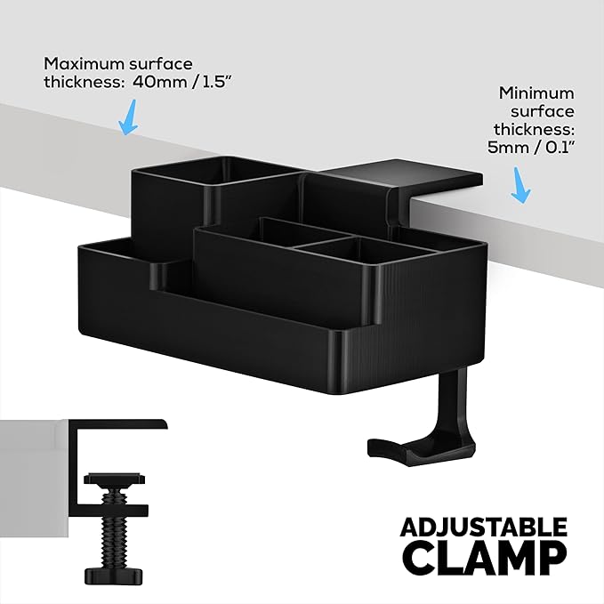 - ADJUSTABLE CLAMP FOR EASY MOUNTING: Securely clamps onto desks, shelves, or any surfaces between 0.1 to 1.5 inches thick. This versatile organizer is quick to install with its adjustable, no-tools clamp, freeing up desk space and reducing clutter.