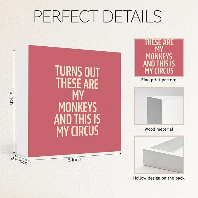 Funny Pink Office Home Desk Table Decor Wood Sign - Turns Out These Are My Monkeys And This Is My Circus, Fun Desk Accessories for Work, Office Decorations for Work Women, Boss Gift, 5x5 Inch