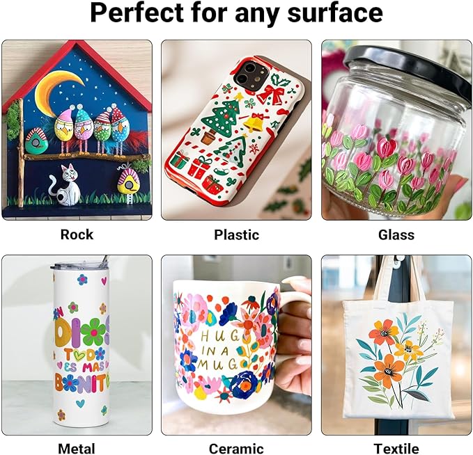 - Suitable for mulit surfaces - Acrylic paint pens are suitable for most surfaces such as fabric, petroglyphs, glass, wood, metal, plastic and even pumpkins, leaving a permanent mark. So it is great for painting, doodling, crafting, holiday decorations and other activities. Premium coloring markers for adults and kids.