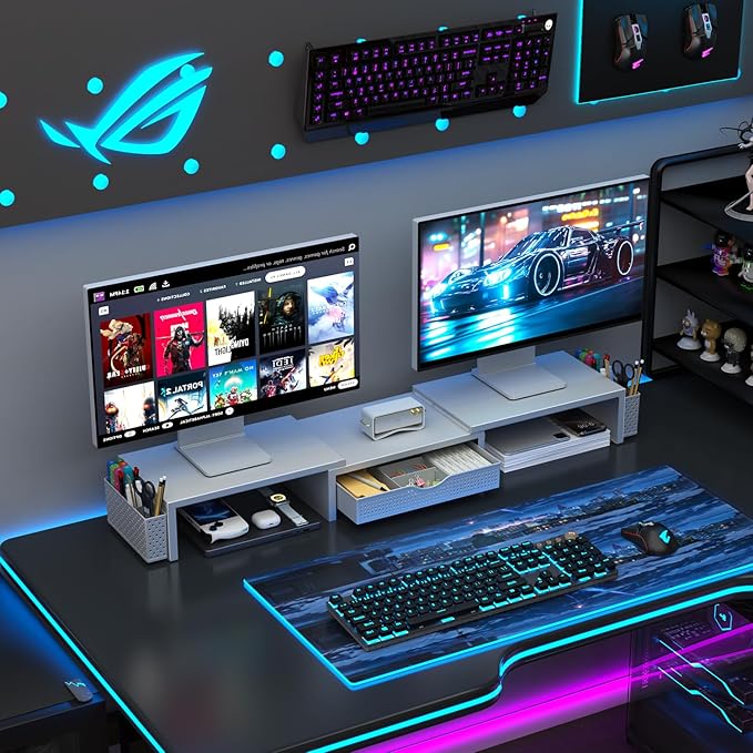 - 【Ample Storage Space】The dual monitor stand features two magnetic pen holders and a drawer, allowing you to easily organize your desk accessories and office supplies, keeping your workspace clear and tidy for easier access.